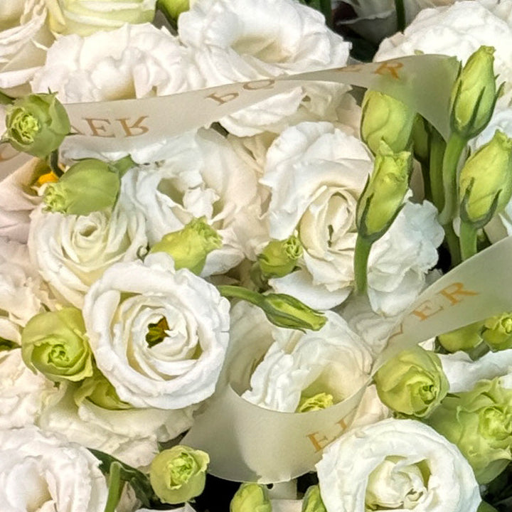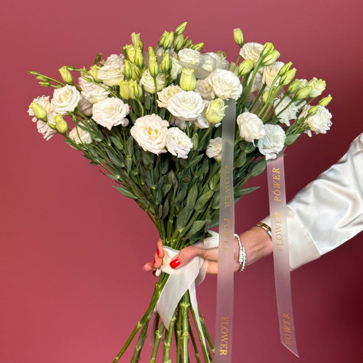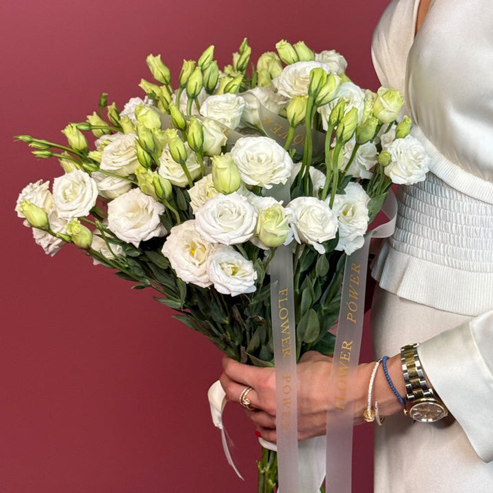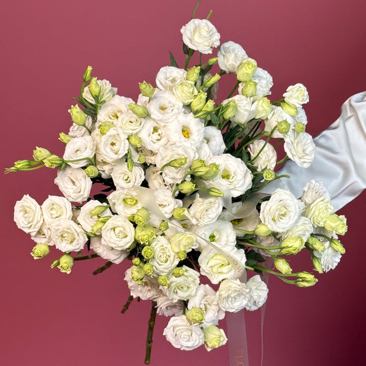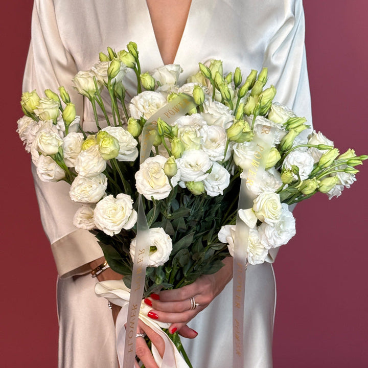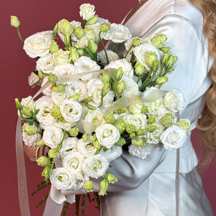 Склад: преміальна біла еустома (лізіантус) (11 стебел), легка сезонна зеленінь, пастельне пакування у відтінках айворі чи білого, оздоблене атласною стрічкою. Кількість стебел може змінюватися залежно від сезону, але збережено загальний стиль і об’єм.