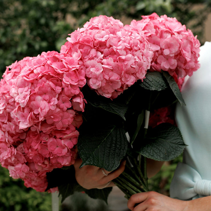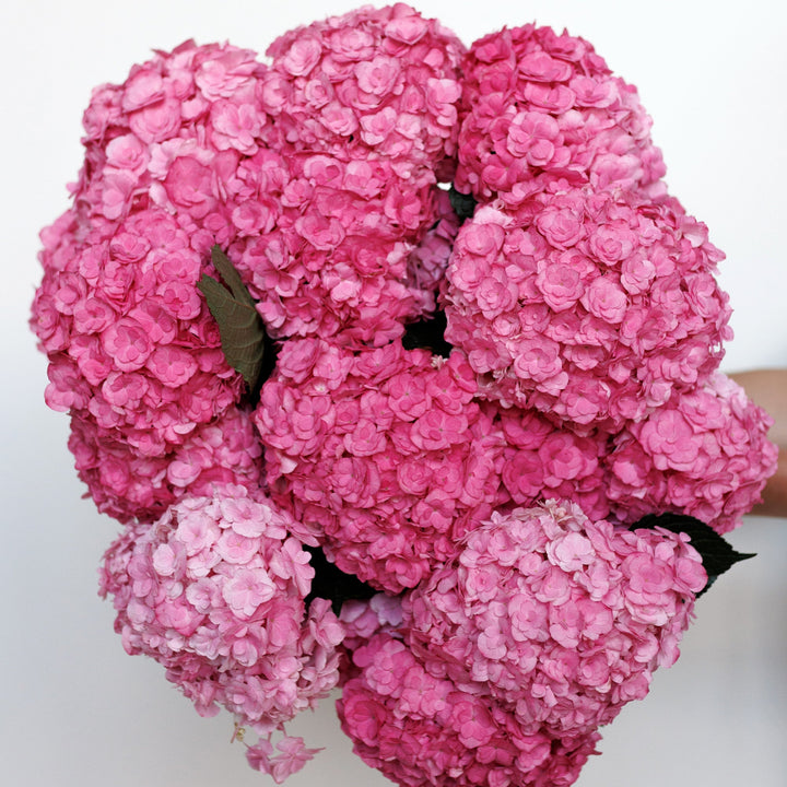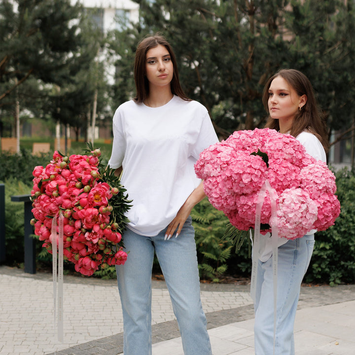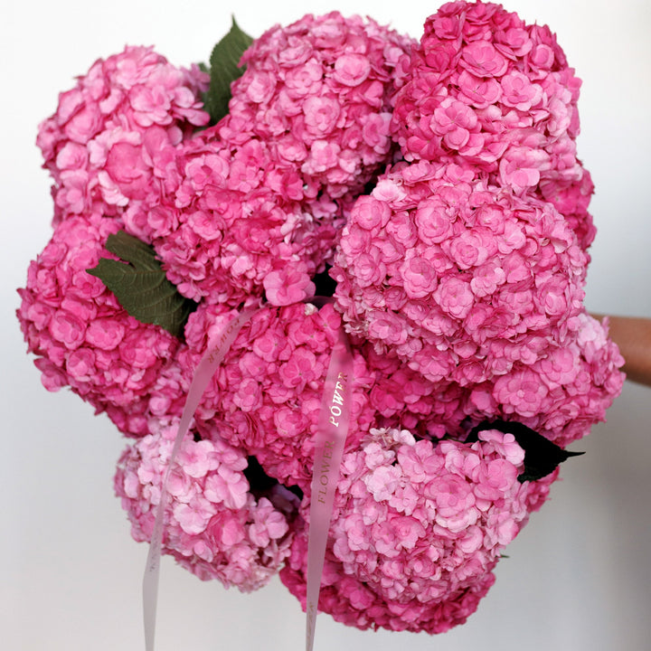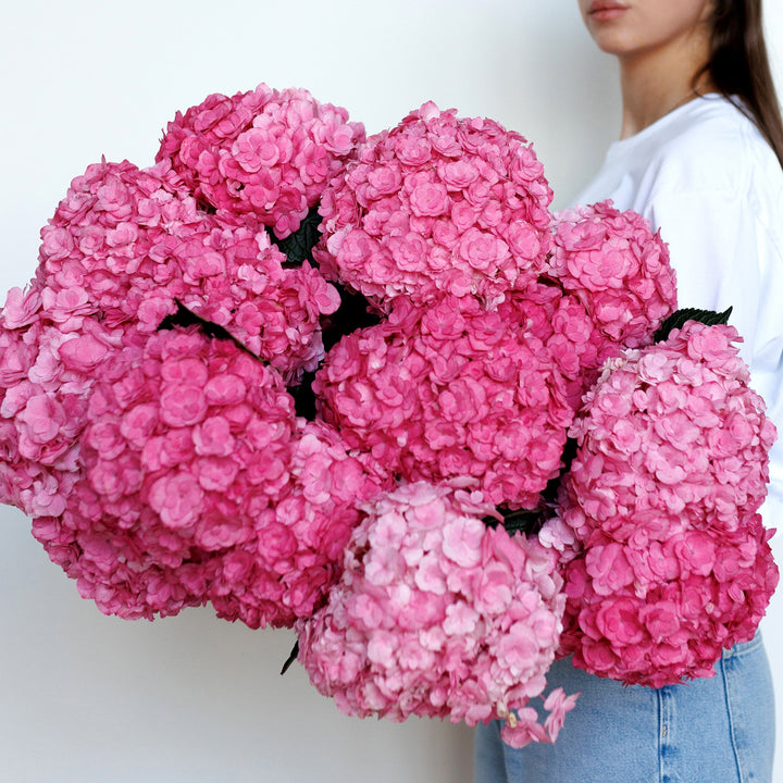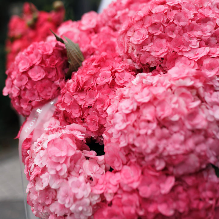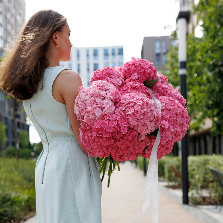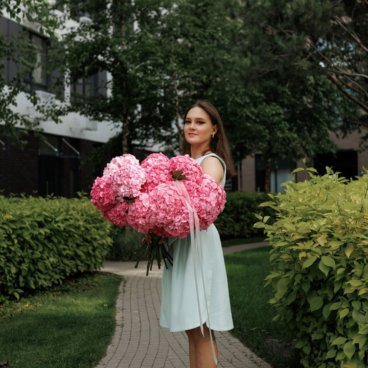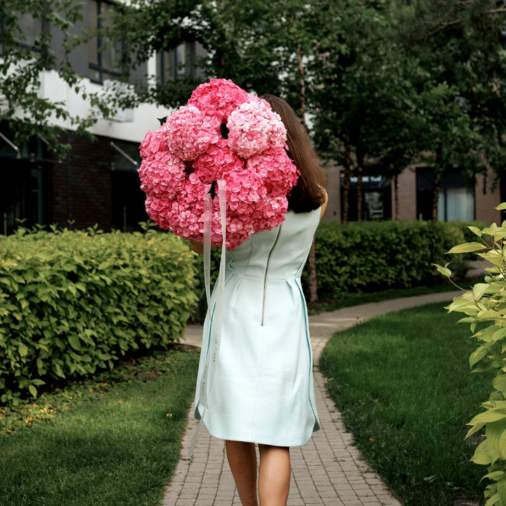 Букет Аура — це вибух емоцій у фуксійно-рожевих тонах. Великі суцвіття гортензій зібрані у пишну круглу композицію, яка нагадує рожеву хмарку — ефектну та фотогенічну. Її об’єм та вишуканість створюють справжній вау‑ефект, підкреслюючи стиль і статус власника. Це розкішний вибір, який однаково доречний як у весільному образі, так і у форматі преміального подарунка.