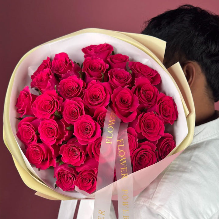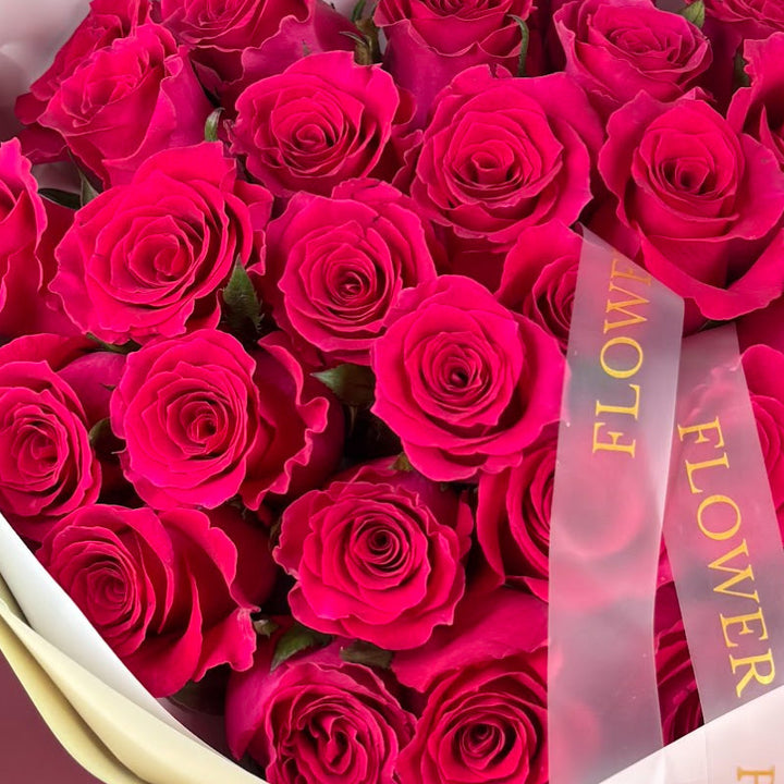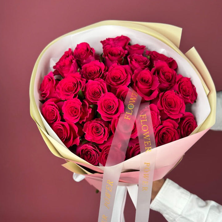 Склад: преміальні троянди насиченого фуксійного кольору, оформлені у ніжний пастельний папір.