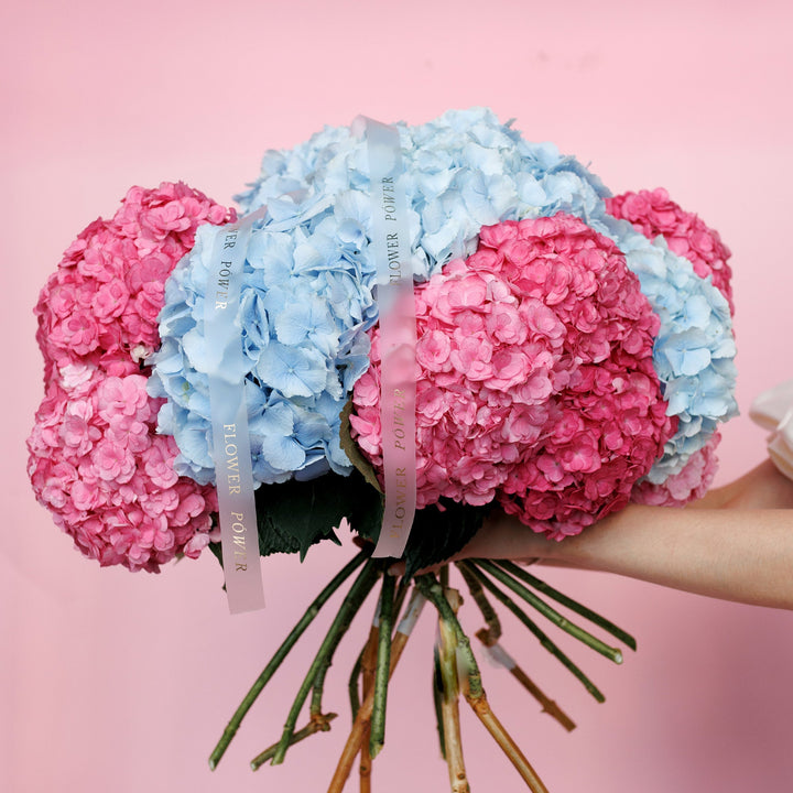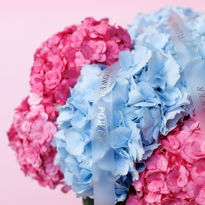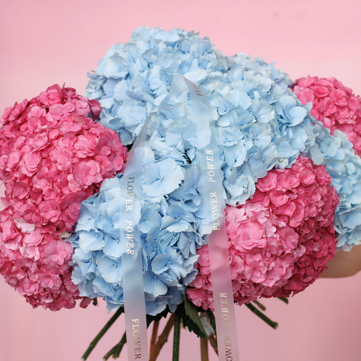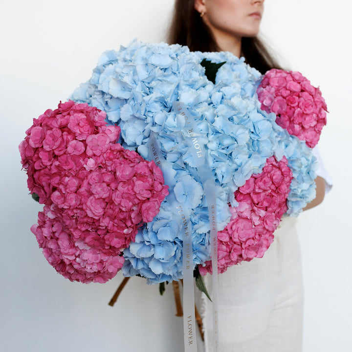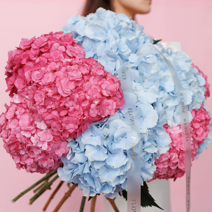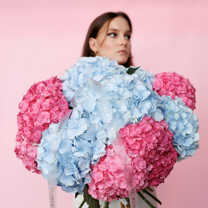 Склад: відбірні гортензії преміальної якості у рожево-блакитній гамі, оформлені у стильне пакування з акцентом на елегантність.