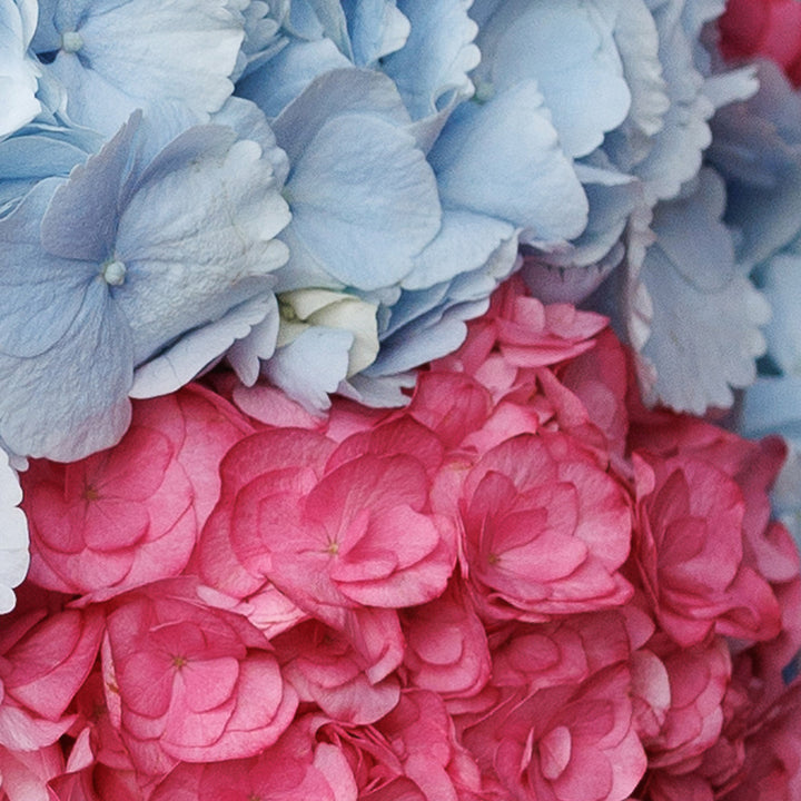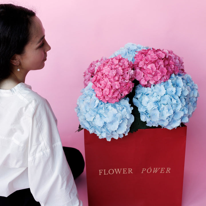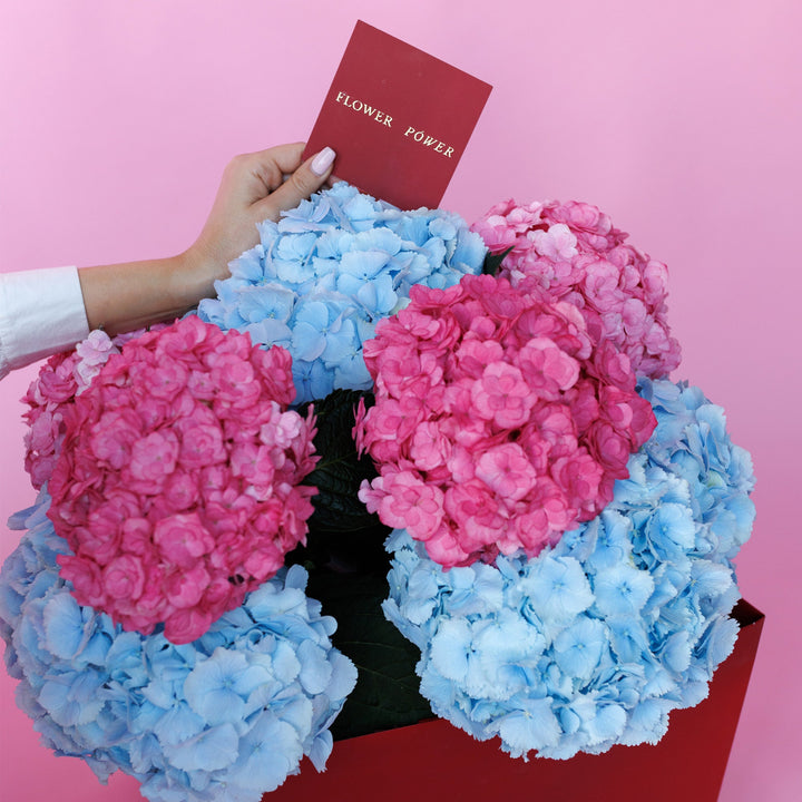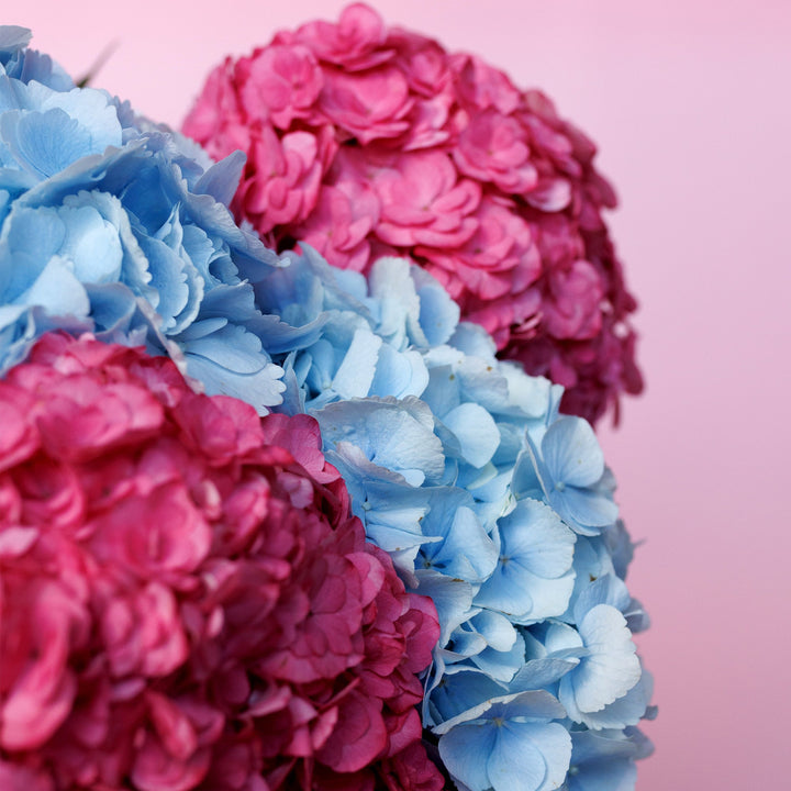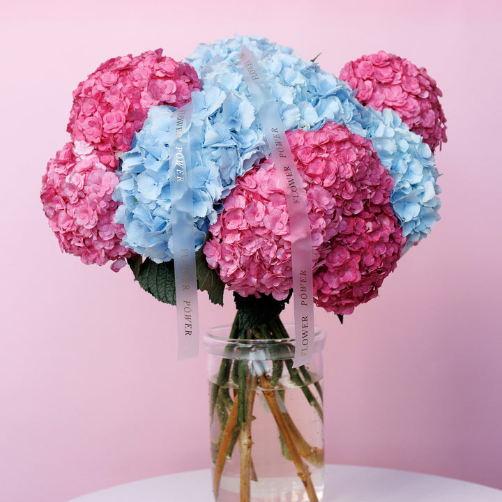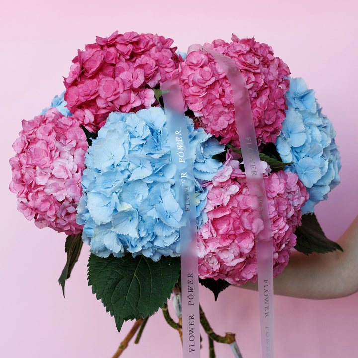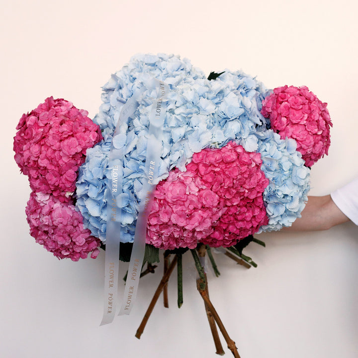 Склад: відбірні гортензії преміальної якості у рожево-блакитній гамі, оформлені у стильне пакування з акцентом на елегантність.