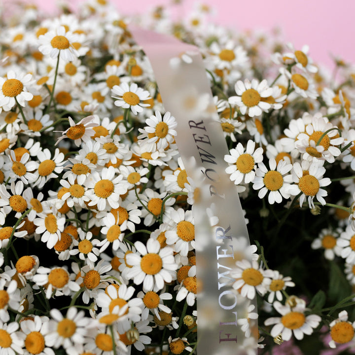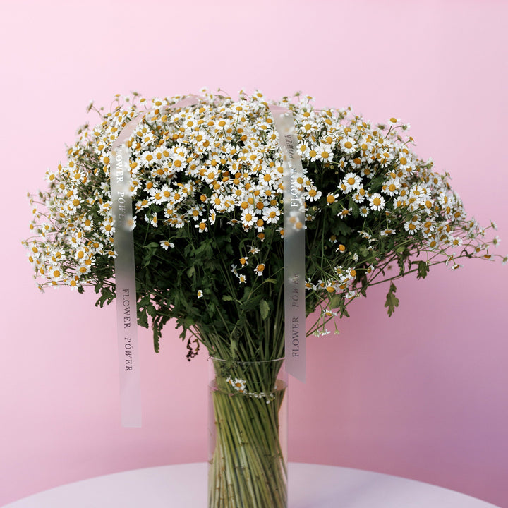 Склад: відбірний танасетум (ромашки) преміальної якості, оформлений у повітряну композицію з акцентом на природну елегантність.