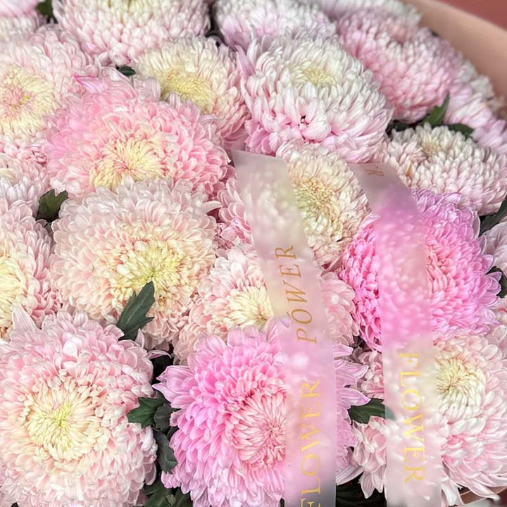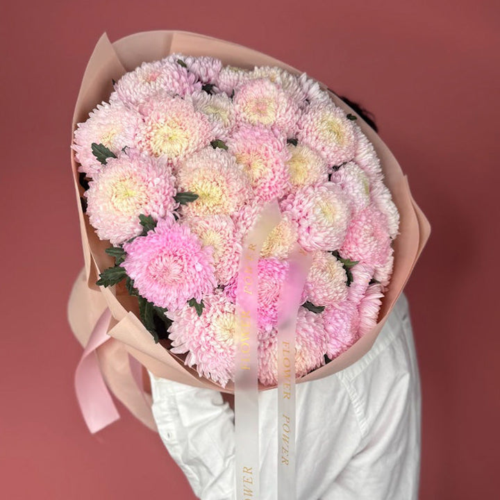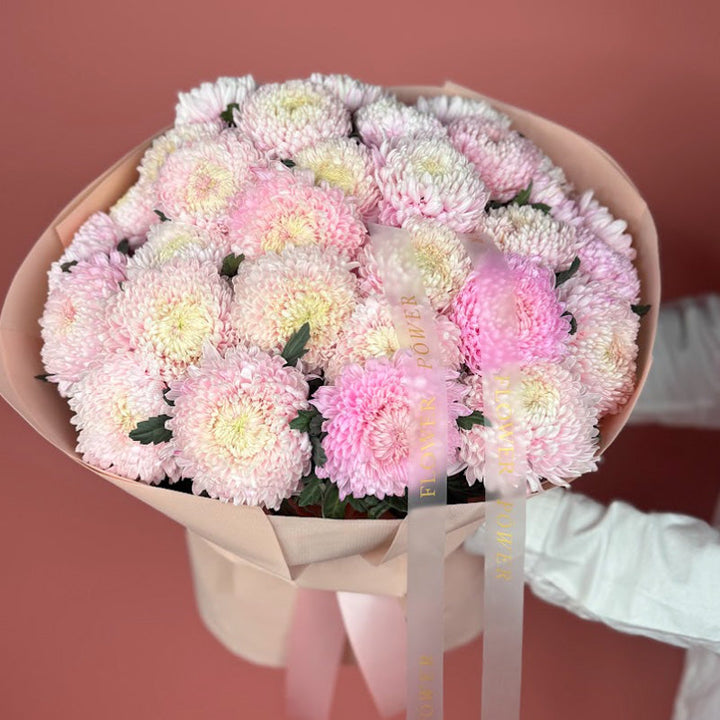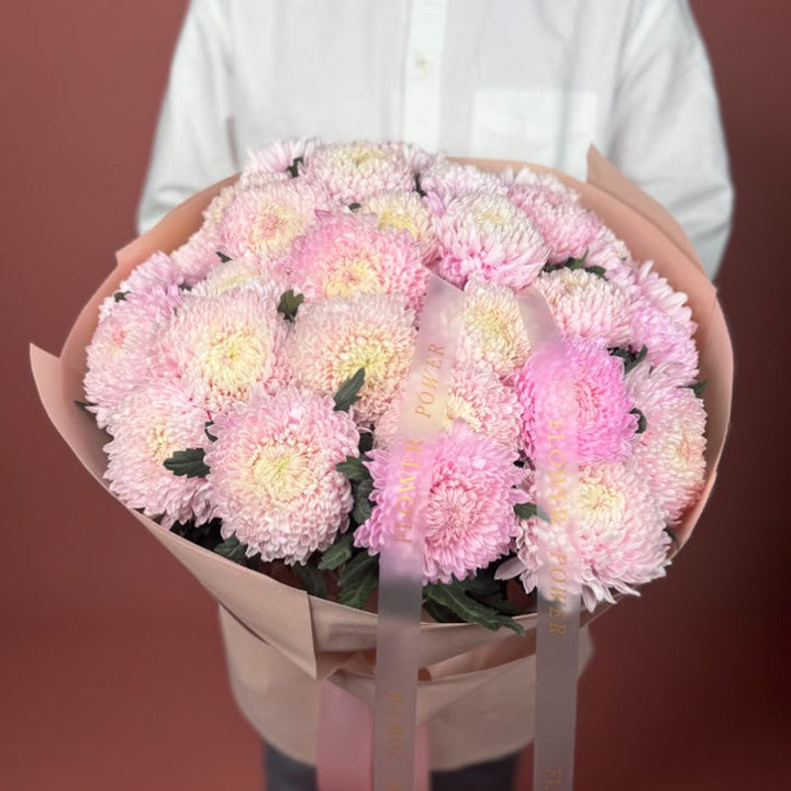 Склад: преміальні рожеві хризантеми з делікатними кремовими серединками, оформлені у стильний папір пастельних відтінків.