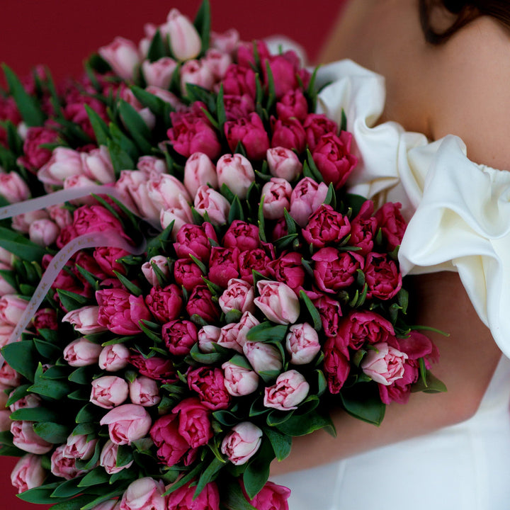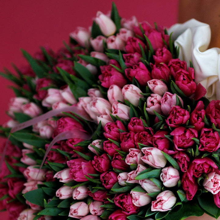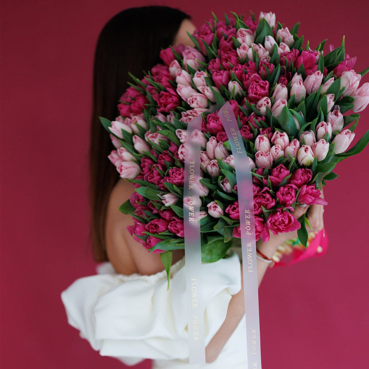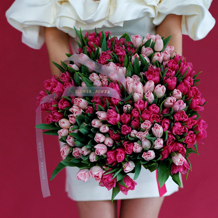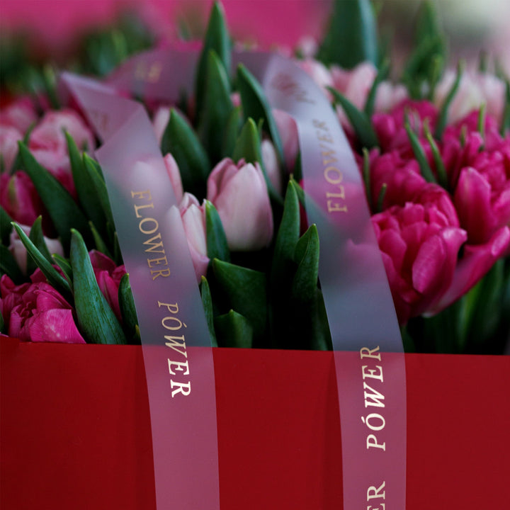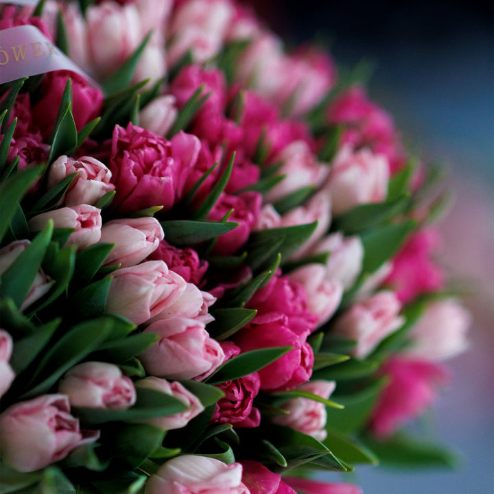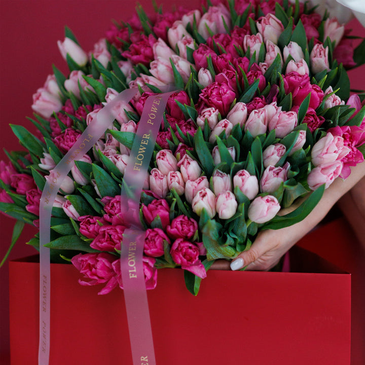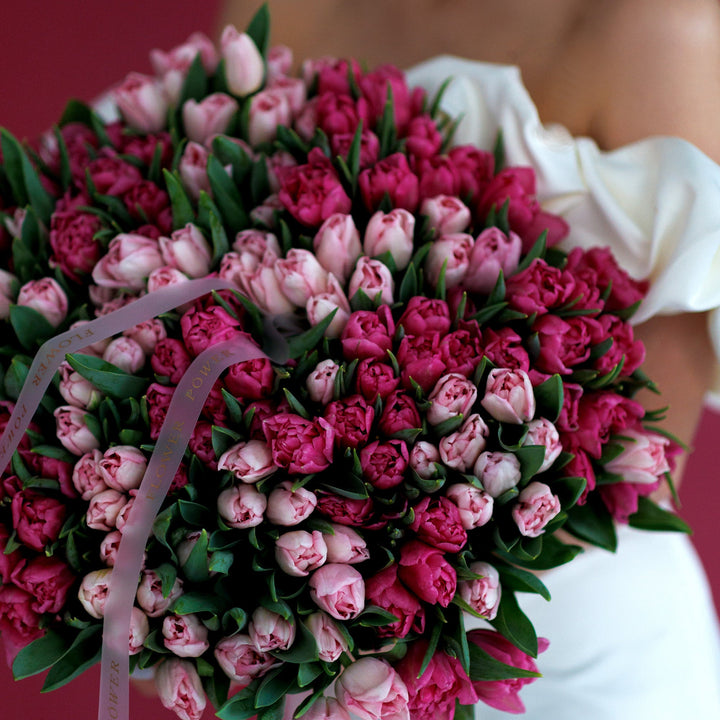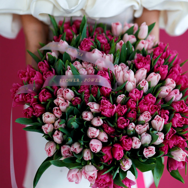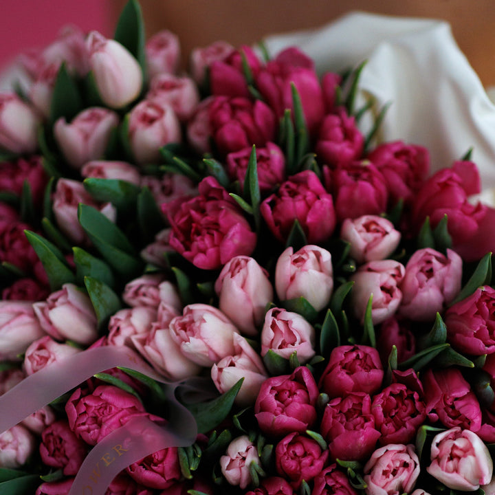 Склад: відбірні рожеві тюльпани, зібрані у багатий об’єм, оформлені у стильне пакування з акцентом на елегантність і преміальність.