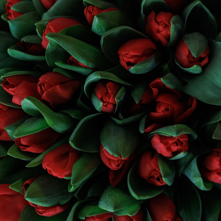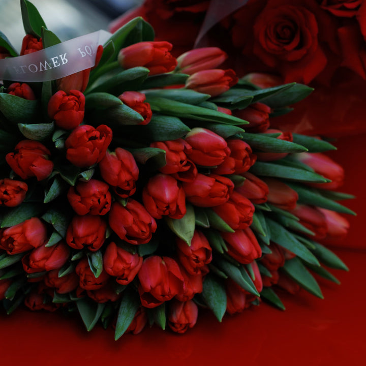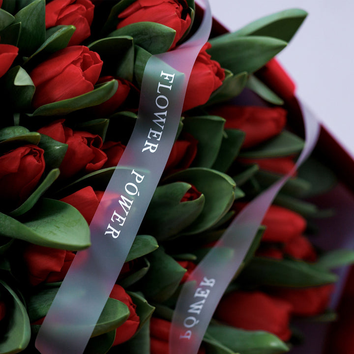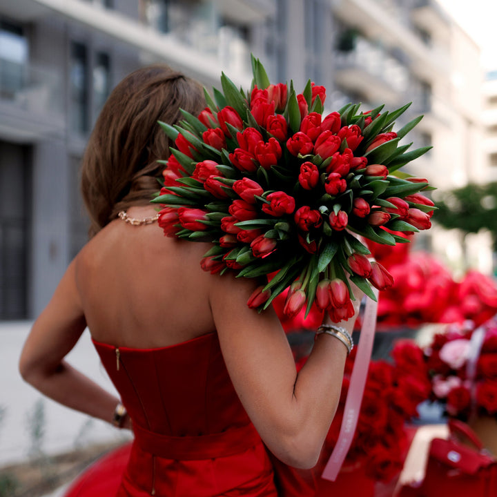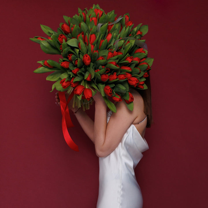 Склад: відбірні червоні тюльпани преміальної якості з легкою зеленою фактурою для балансу, оформлені у стильне пакування.