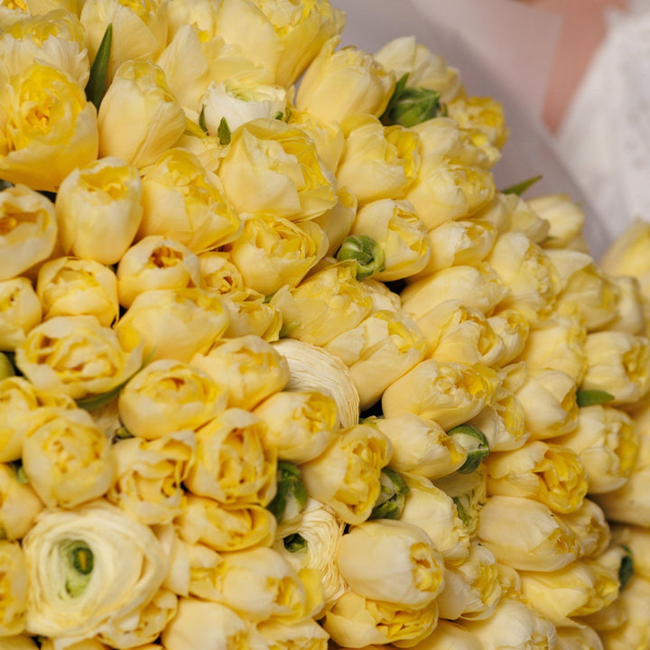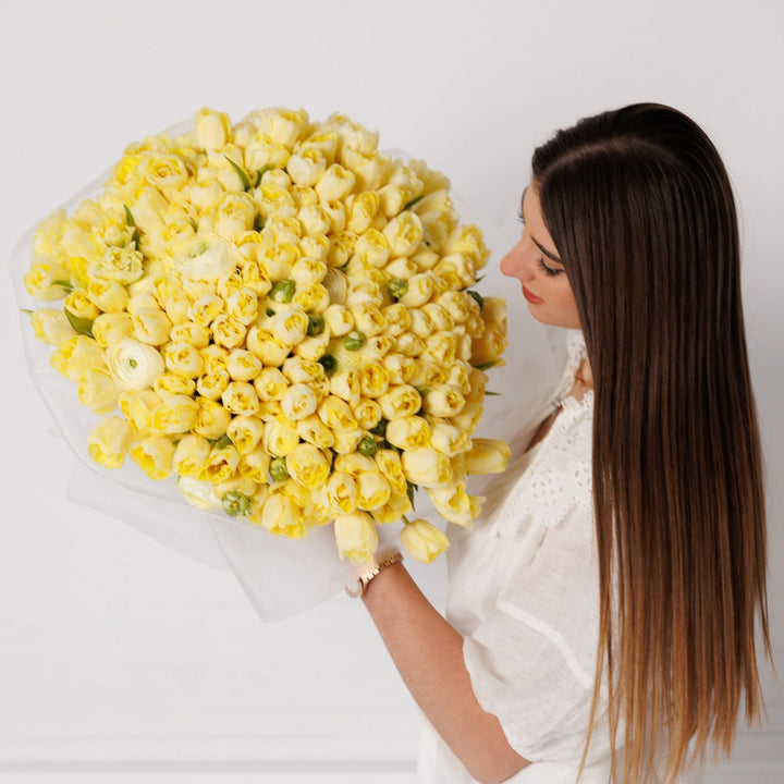 Справжнє диво з жовтих тюльпанів та ранункулюсів, поєднаних у розкішному флористичному шедеврі. Наше Барвисте Диво вражає з першого погляду своїм надзвичайно великим розміром та неймовірним ароматом найсвіжіших квітів з Європи.