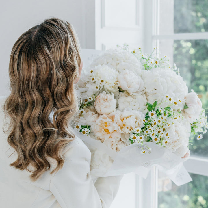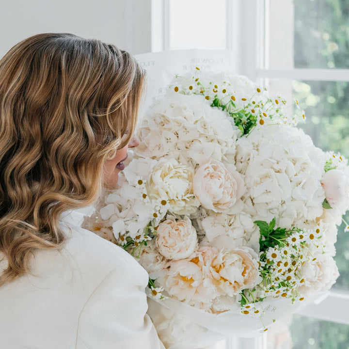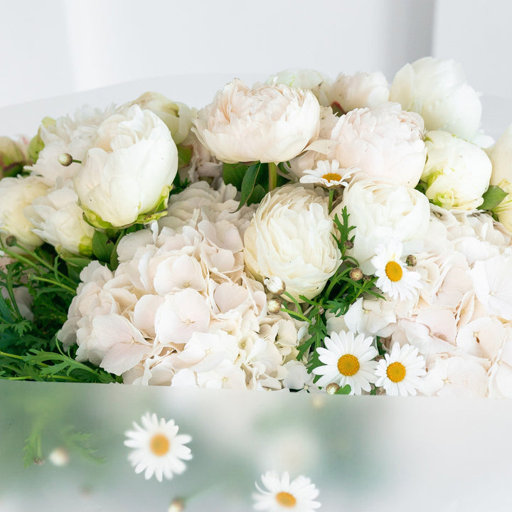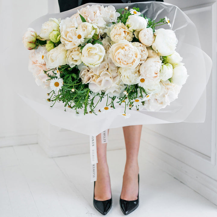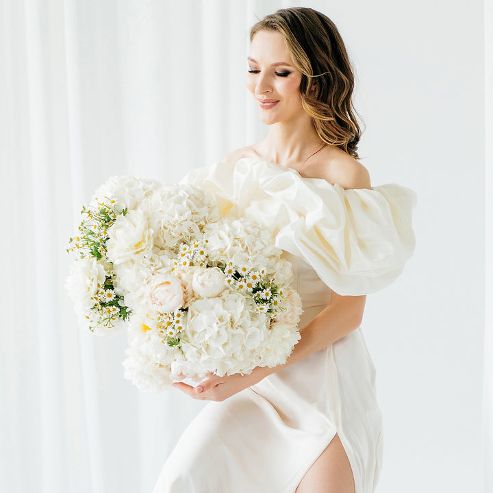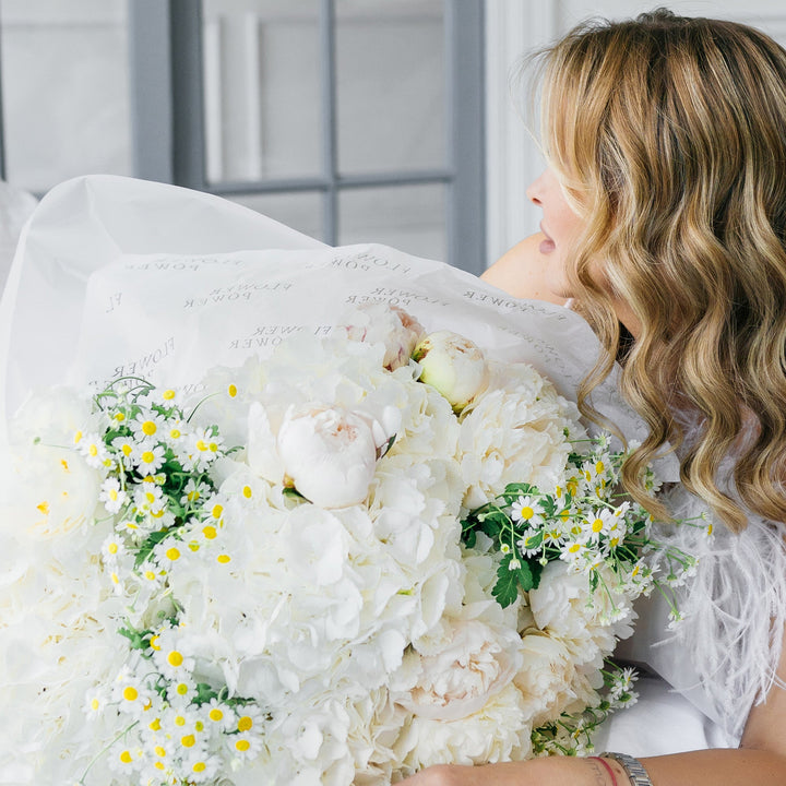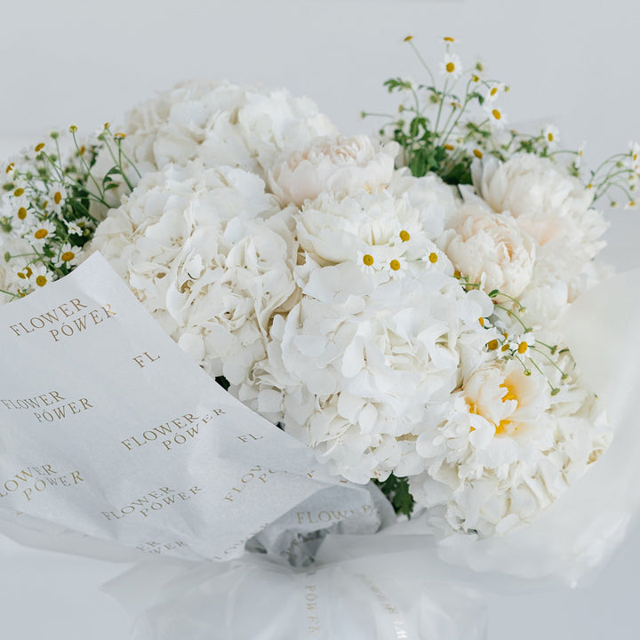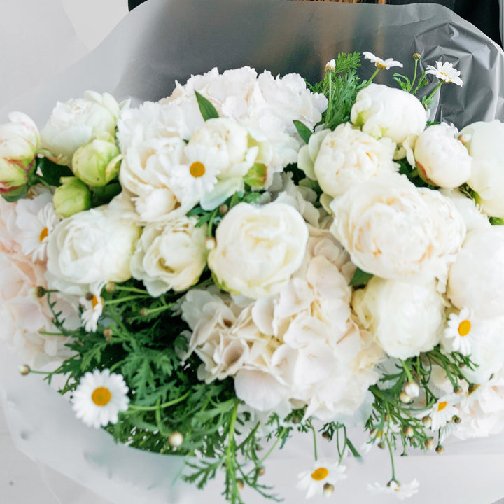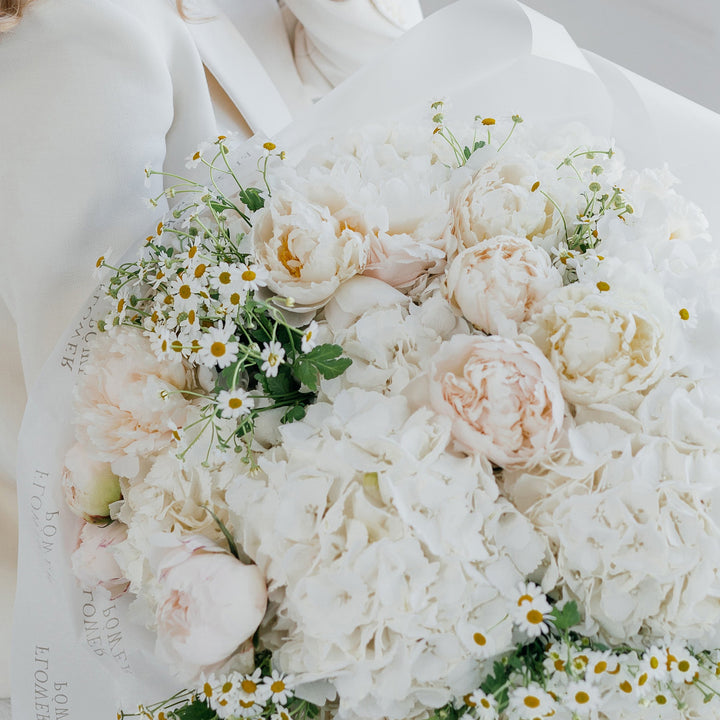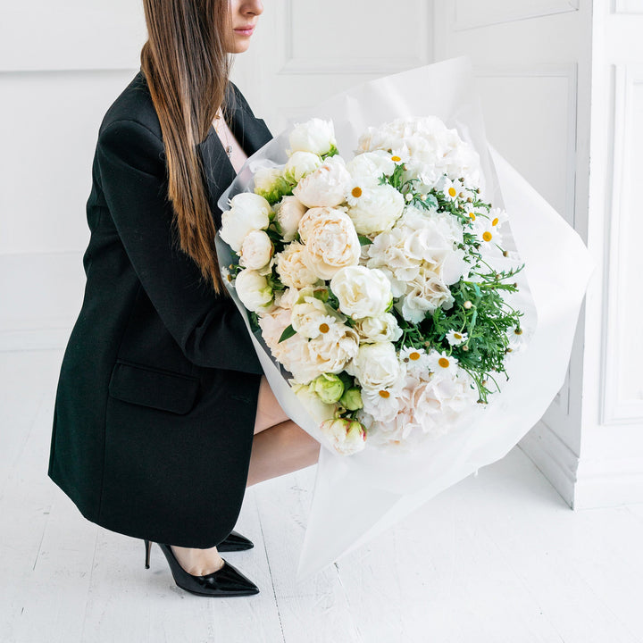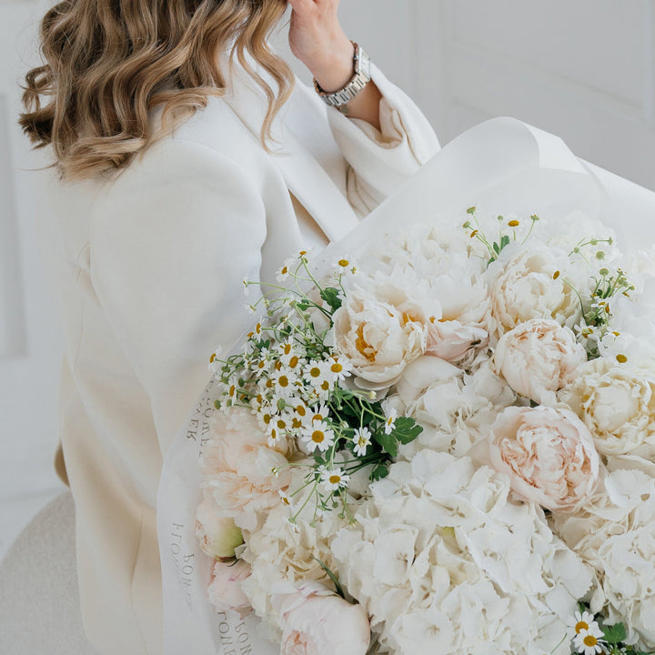 Якщо ви шукаєте найневинніший, радісний і життєрадісний дизайн букету, можемо сказати, що наша Флорінка — це бінго! Великий, наче хмаринка, білий букет із ромашок, гортензій та делюкс-півоній вражає гармонією вигляду й аромату. Це ідеальний вибір для юних подружок нареченої та дівчат, які збираються на випускний. Флорінка стане бездоганним декором для дому та дорогим серцю подарунком на будь-яку нагоду. Просто придбайте Флорінку для мами на День матері, оберіть її для доньки на день народження й не забудьте замовити Флорінку для коханої навіть без приводу — вона пасує до будь-якої дати й пори року, аби бути подарованою з любов’ю.