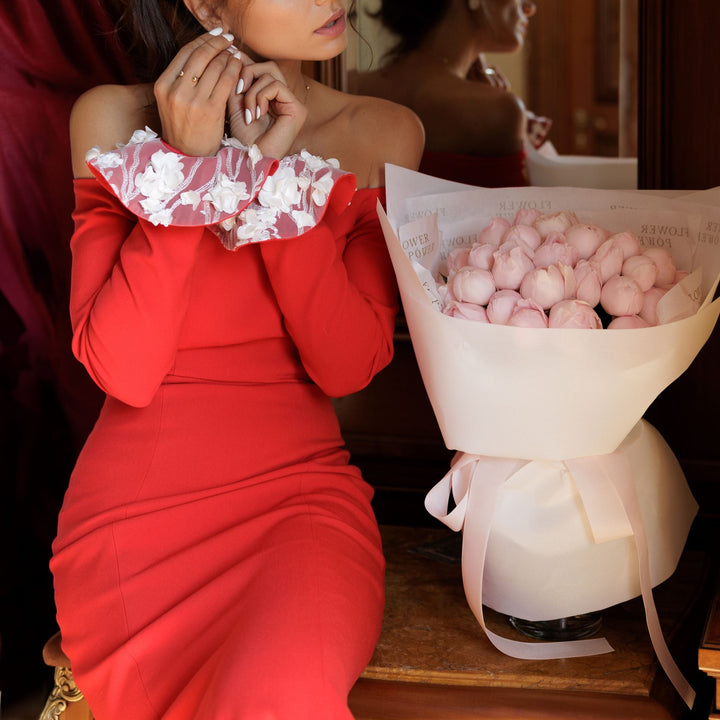 Французький Поцілунок — лаконічна композиція з делюкс садових троянд у найніжніших рожевих відтінках. Щільні великі бутони з багатьма пелюстками розкриваються поступово, утворюючи пишну «хмару» аромату. Акуратне крафтове рожеве пакування підкреслює елегантність і стриману розкіш. Ідеальний для освідчення, побачення, дня народження або як стильний комплімент без приводу. Збираємо лише зі свіжих квітів преміум якості з європейських теплиць — букет тішитиме довго.