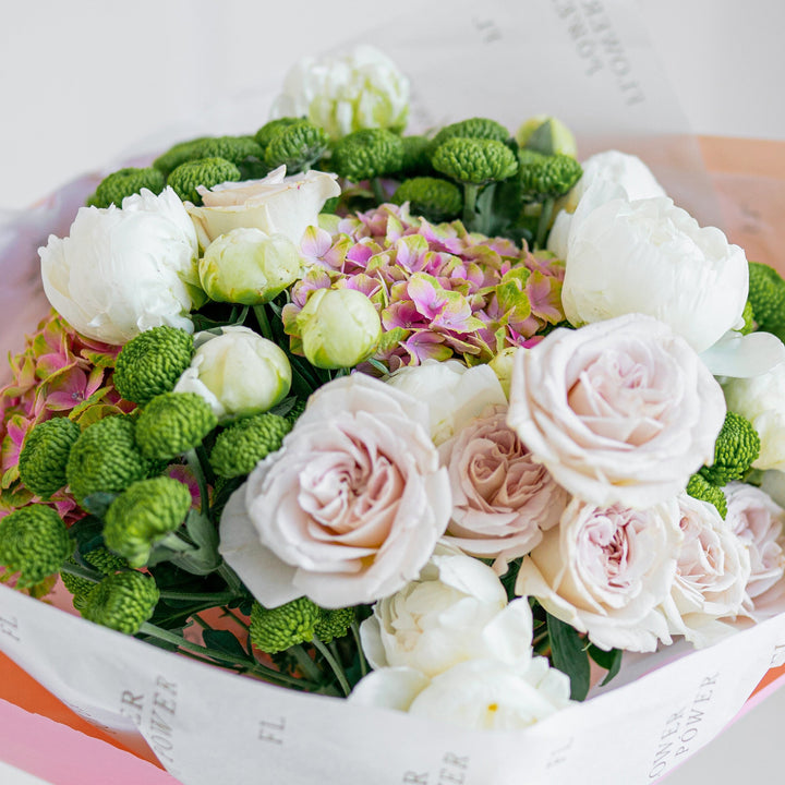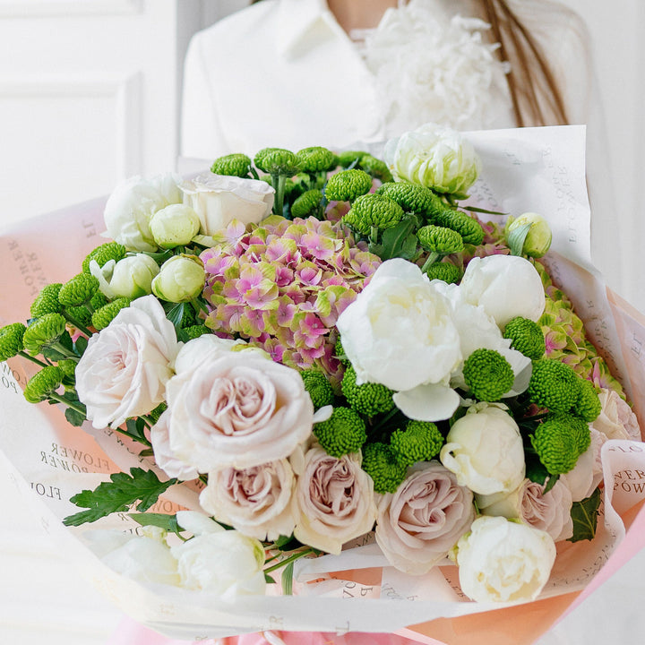 Букет з гортензіями, хризантемами та трояндами Мачо Ґрін